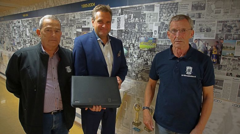 På billedet ses fra venstre 100-Mandsklubbens kasserer Peter Fester, i midten bestyrelsesformand i Brøndbyernes IF Christian Barrett og til højre 100-Mandsklubbens formand Asger Welander.