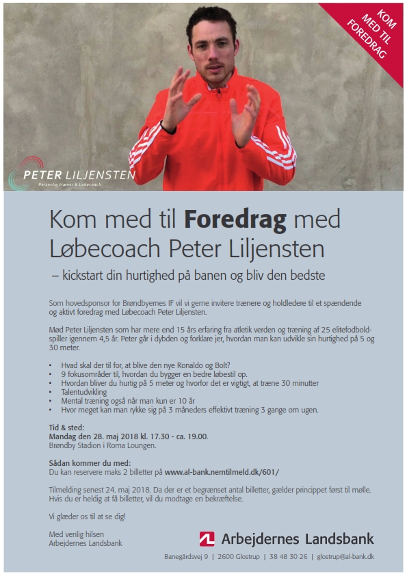 Brøndbyernes IF's hovedsponsor Arbejdernes Landsbank vil gerne invitere trænere og ledere til et spændende foredrag med Løbecoach Peter Liljensten.