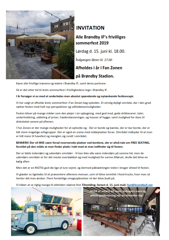 Årets sommerfest for frivillige trænere og ledere i Brøndby IF bliver som tidlige annonceret afholdt lørdag d. 15. juni kl. 18.00 i Fanzonen på Brøndby Stadion.
