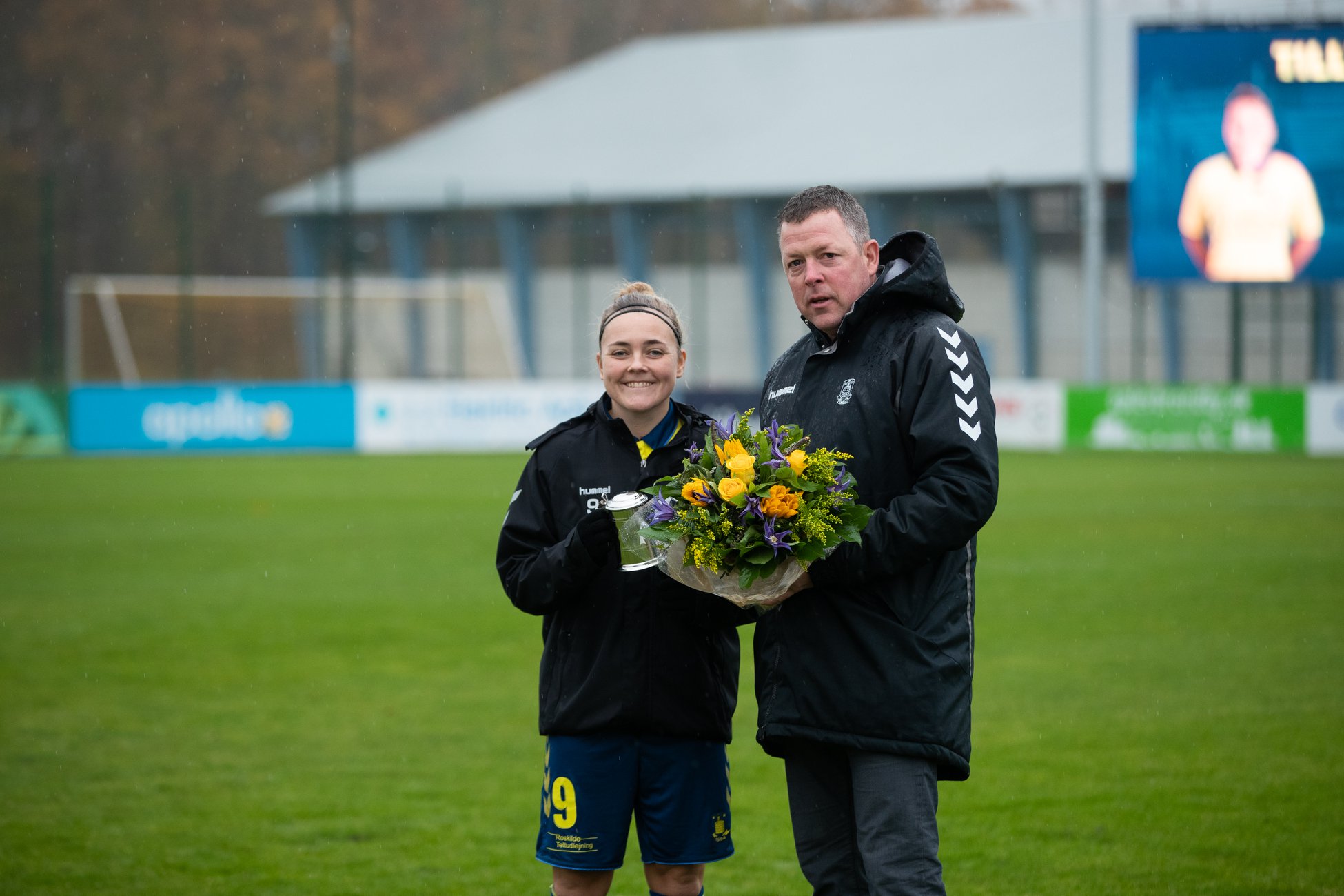 Emilie Henriksen, Kamilla Karlsen og Caroline Pleidrup fik alle overrakt blomster og jubilæumskrus for 50 spillede kampe, men Katrine Abel fik det for 150 kampe.