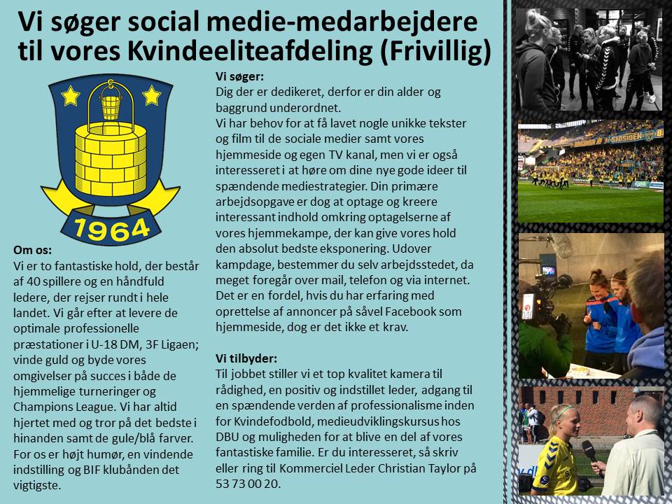 Vi har behov for at fået lavet nogle unikke tekster, film, optagelser og lign. med brug af dine ideer og tanker, på især kampdage. Til jobbet stiller vi et top kamera til rådighed, en positiv indstillet leder og en spændende verden af professionalisme indenfor Kvindefodbold, der byder på præstationer fra U-18 DM og op til Kvindernes Champions league opgør.